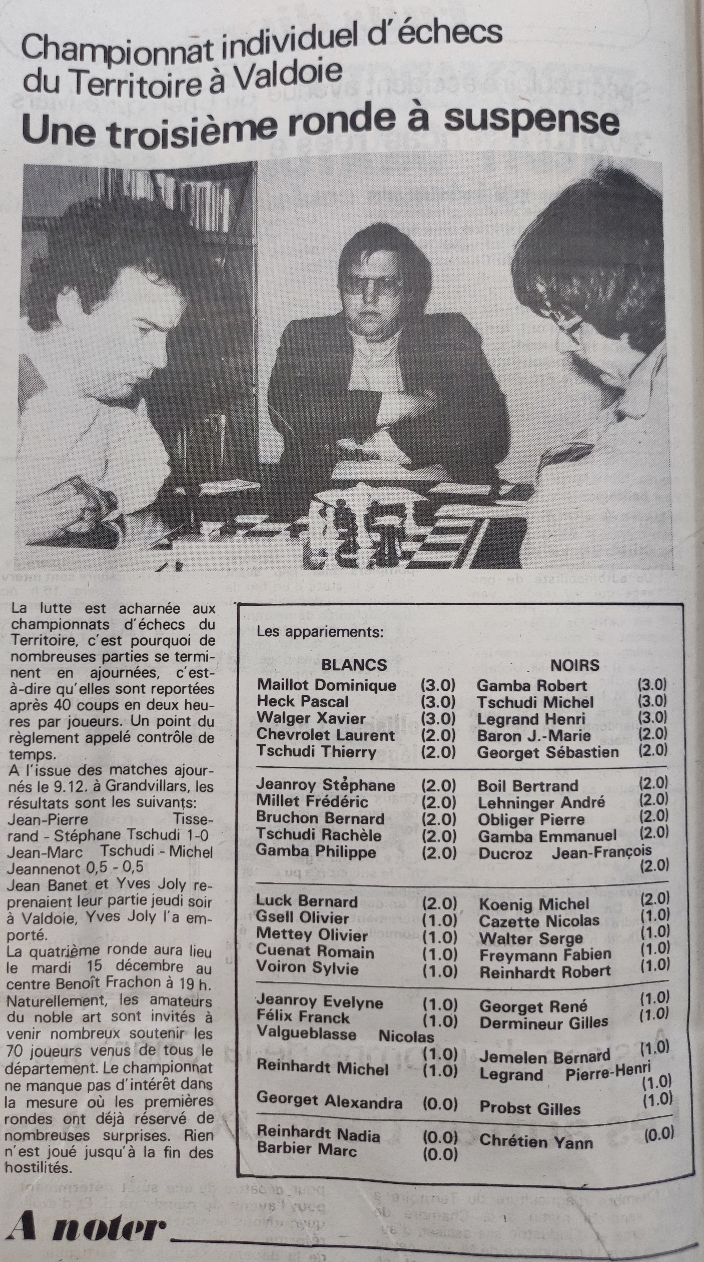 À l'issue des matches ajournés le 9.12. à Grandvillars, les résultats sont les suivants: Jean-Pierre Tisserand - Stéphane Tschudi 1-0 Jean-Marc Tschudi - Michel Jeannenot 0,5-0,5 Jean Banet et Yves Joly reprenait leur partie jeudi soir à Valdoie, Yves Joly l'a emporté. La quatrième ronde aura lieu le mardi 15 décembre au centre Benoît Frachon à 19h. Naturellement, les amateurs du noble art sont invités à venir nombreux soutenir les 70 joueurs venus de tous le département. Le championnat ne manque pas d'intérêt dans la mesure où les premières rondes ont déjà réservé de nombreuses surprises. Rien n'est joué jusqu'à la fin des hostilités. Les appariements: