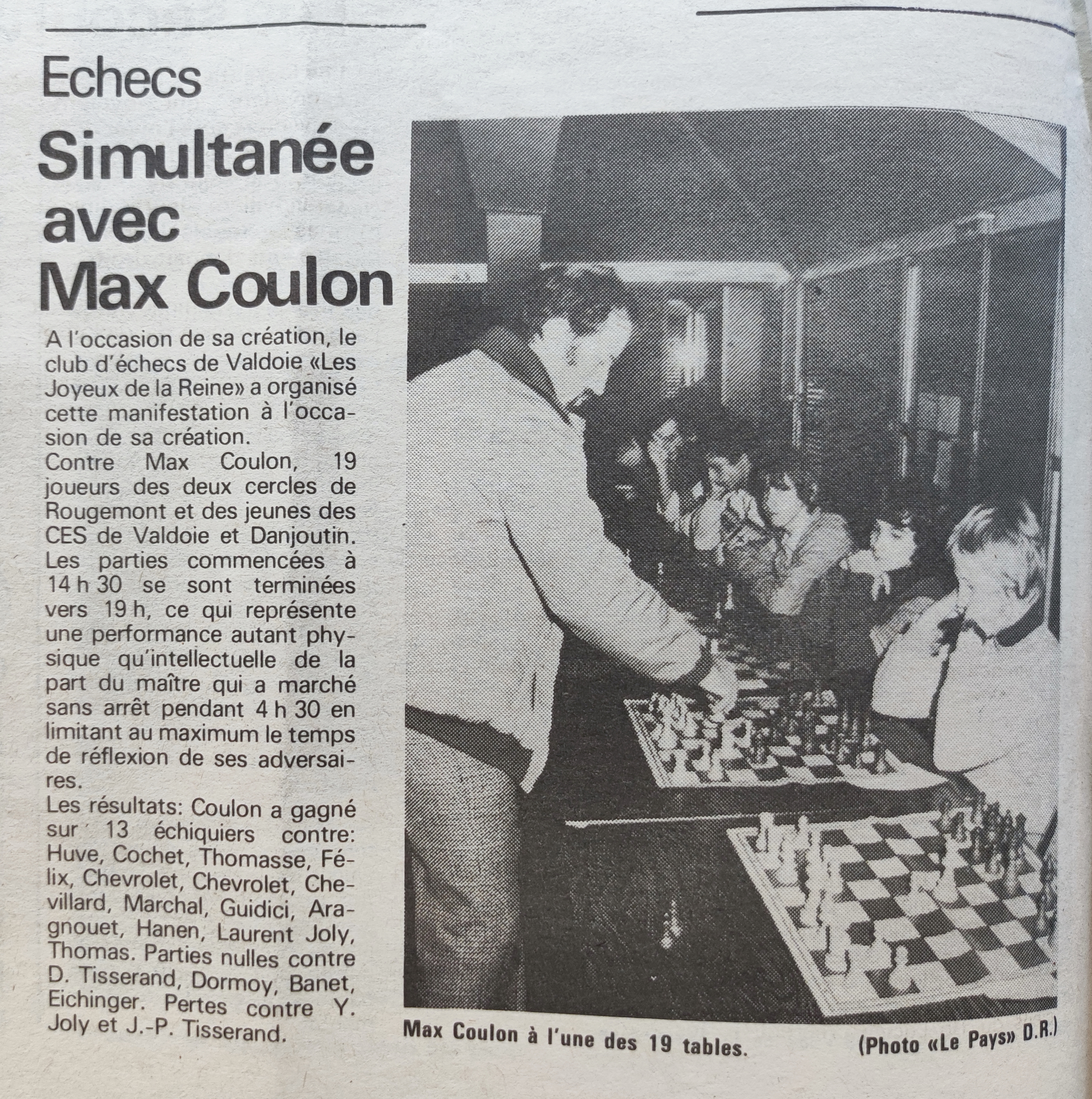 Contre Max Coulon, 19 joueurs des deux cercles de Rougemont et des jeunes des CES de Valdoie et Danjoutin. Les parties commencées à 14h30 se sont terminées vers 19h, ce qui représente une performance autant physique qu'intellectuelle de la part du maître qui a marché sans arrêt pendant 4h30 en limitant le temps de réflexion de ses adversaires. Les résultats : Coulon a gagné sur 13 échiquiers contre : Huve, Cochet, Thomasse, Félix, Chevrolet, Chevrolet, Chevillard, Marchal, Guidici, Aragnouet, Hanen, Laurent Joly, Thomas. Parties nulles contre D. Tisserand, Dormoy, Banet, Eichinger. Pertes contre Y. Joly et J.-P Tisserand. |