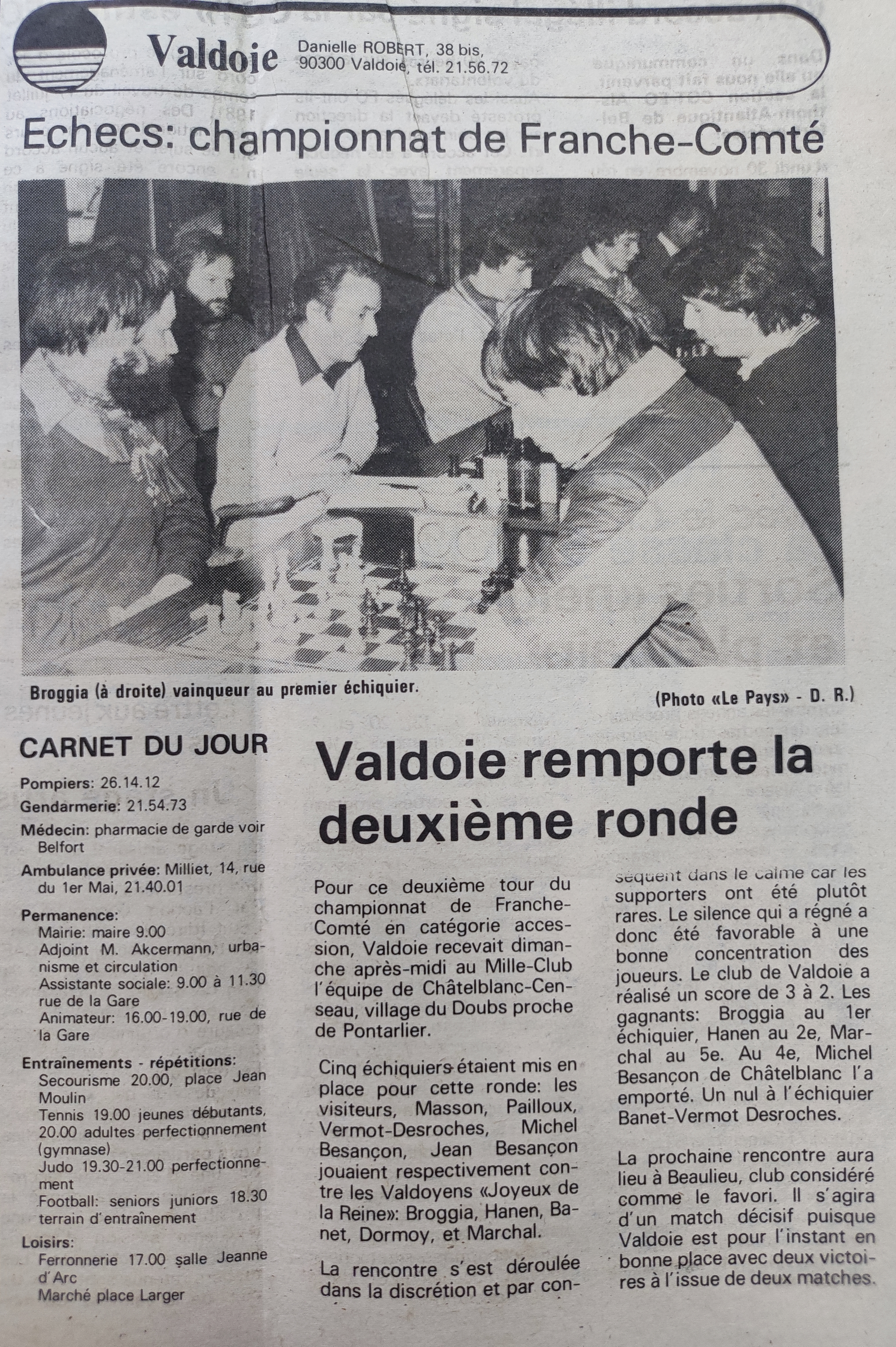 Cinq échiquiers mis en place pour cette ronde : les visiteurs, Masson, Pailloux, Vermot-Desroches, Michel Besançon, Jean Besançon jouaient respectivement contre les Valdoyens « Les Joyeux de la Reine » : Broggia, Hanen, Banet, Dormoy, et Marchal. La rencontre s'est déroulée dans la discrétion et par conséquent dans le calme car les supporters ont été plutôt rares. Le silence qui a régné a donc été favorable à une bonne concentration des joueurs. Le club de Valdoie a réalisé un score de 3 à 2. Les gagnants : Broggia au 1er échiquier, Hanen au 2e, Marchal au 5e. Au 4e Michel Besançon de Châtelblanc l'a emporté. Un nul à l'échiquier Banet-Vermot Desroches. La prochaine rencontre aura lieu à Beaulieu, club considéré comme le favori. Il s'agira d'un match décisif puisque Valdoie est pour l'instant en bonne place avec deux victoires à l'issue de deux matches. |