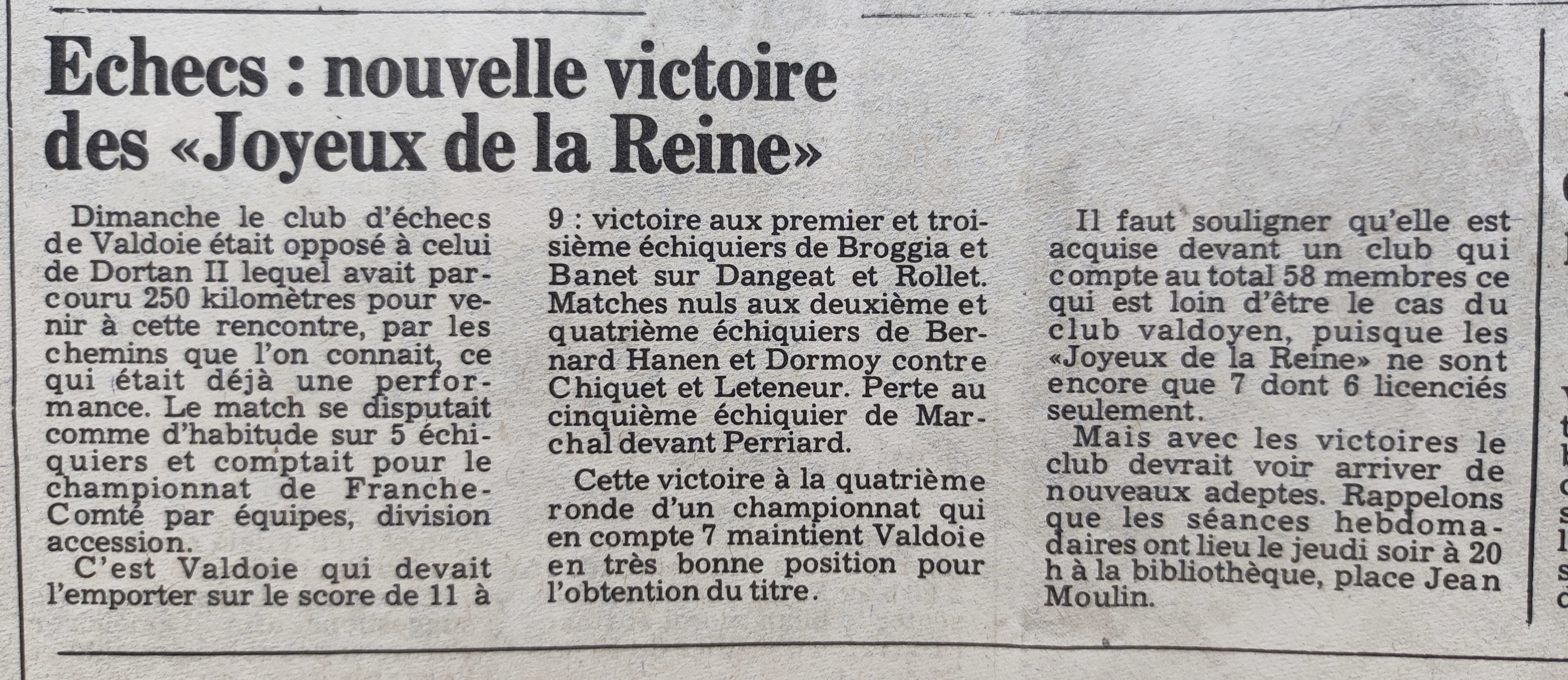 C'est Valdoie qui devait l'emporter sur le score de 11 à 9 : victoire aux premiers et troisième échiquiers de Broggia et Banet sur Dangeat et Rollet. Matches nuls aux deuxième et quatrième échiquiers de Bernard Hanen et Dormoy contre Chiquet et Leteneur. Perte au cinquième échiquier de Marchal devant Perriard