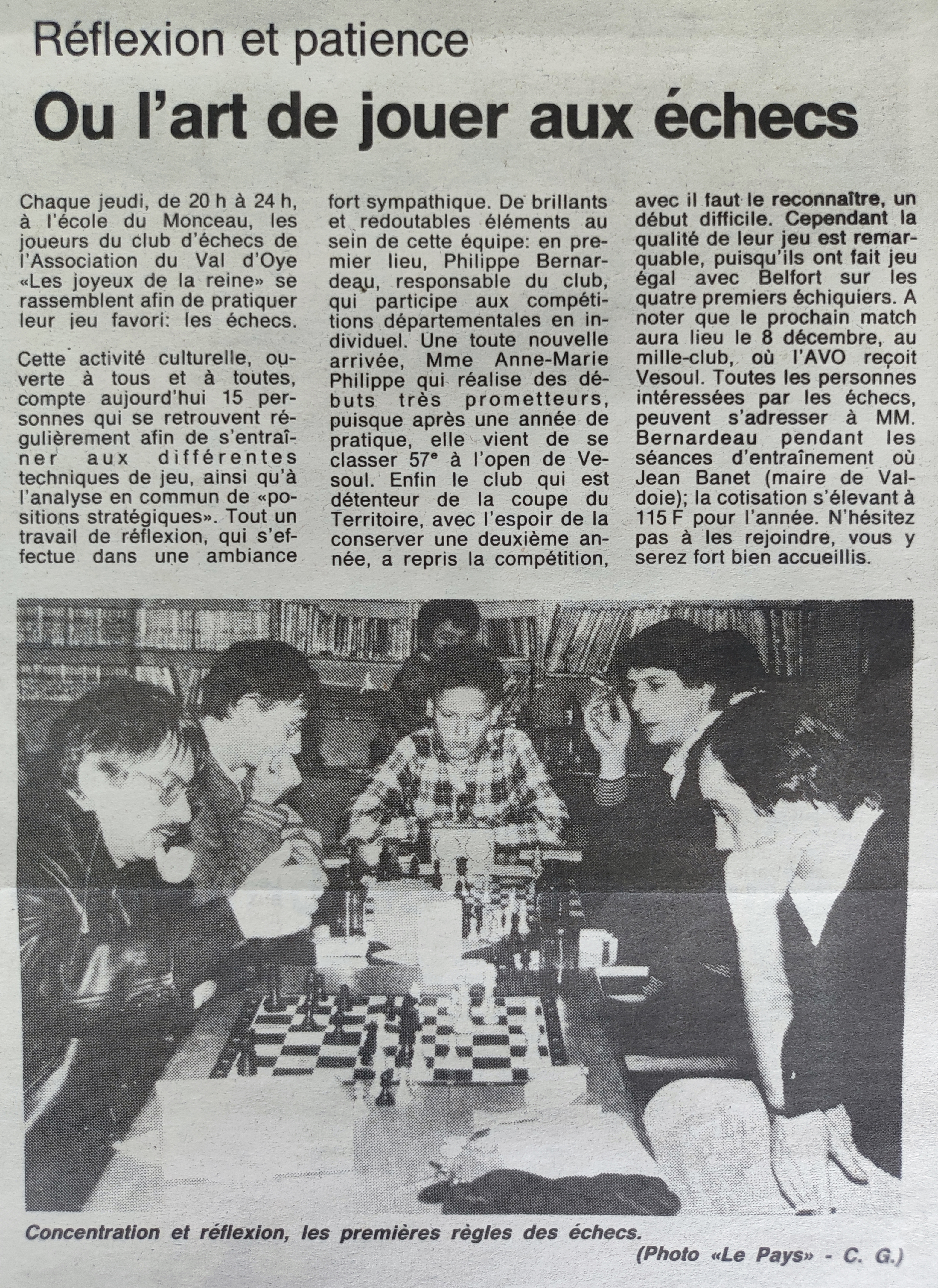 Cette activité culturelle, ouverte à tous et à toutes, compte aujourd'hui 15 personnes qui se retrouvent régulièrement afin de s'entraîner aux différentes techniques de jeu, ainsi qu'à l'analyse en commun de « positions stratégiques ». Tout un travail de réflexion, qui s'effectue dans une ambiance fort sympathique. De brillants et redoutables éléments au sein de cette équipe: en premier lieu, Philippe Bernardeau, responsable du club, qui participe aux compétitions départementales en individuel. Une toute nouvelle arrivée Mme Anne-Marie Philippe qui réalise des débuts très prometteurs, puisque après une année de pratique, elle vient de se classer 57e à l'open de Vesoul. Enfin le club qui est détenteur de la coupe du Territoire, avec l'espoir de la conserver une deuxième année, a repris la compétition avec il faut le reconnaître, un début difficile. Cependant la qualité de leur jeu est remarquable, puisqu'ils ont fait jeu égal avec Belfort sur les quatre premiers échiquiers. À noter que le prochain match aura lieu le 8 décembre, au mille-club, où l'AVO reçoit Vesoul. Toutes les personnes intéressées par les échecs, peuvent s'adresser à MM. Bernardeau pendant les séances d'entraînement ou Jean Banet (mairie de Valdoie); la cotisation s'élevant à 115 F pour l'année. N'hésitez pas à les rejoindre, vous serez fort bien accueillis. |