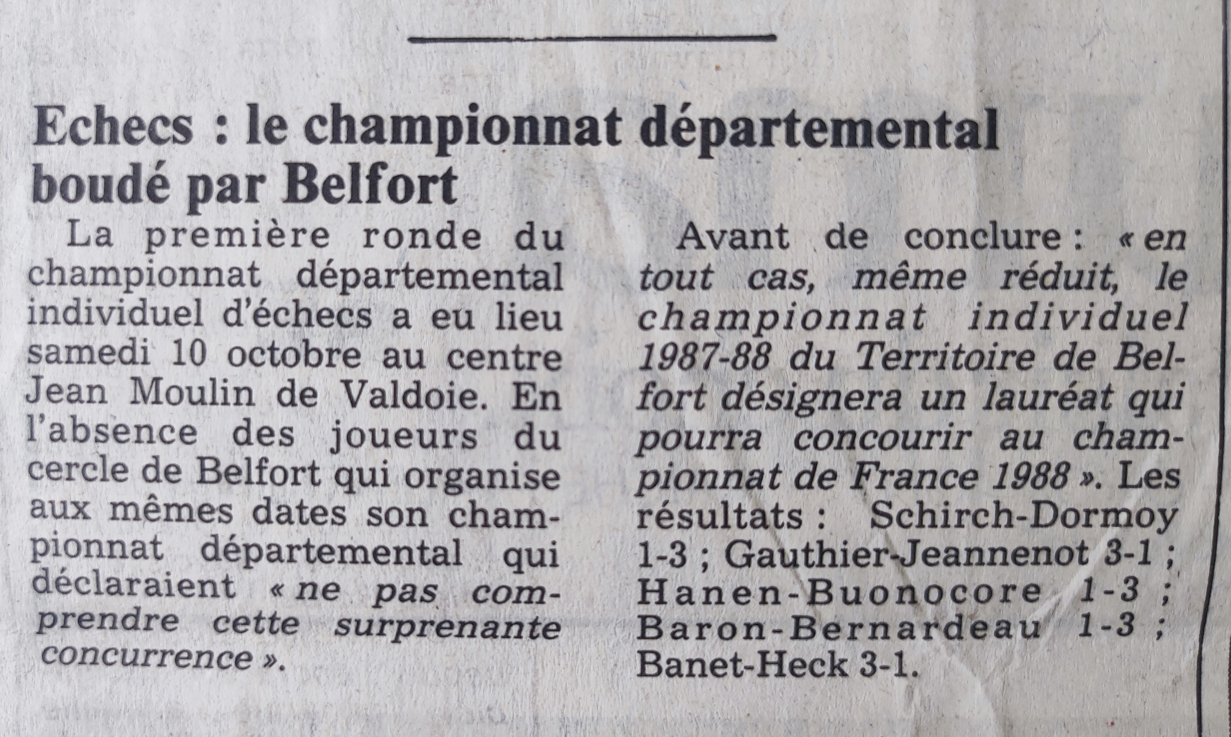 ![]() La première ronde du championnat départemental individuel d'échecs a eu lieu samedi 10 octobre au centre Jean Moulin de Valdoie. En l'absence des joueurs du cercle de Belfort qui organise aux mêmes dates son championnat départemental qui déclaraient « ne pas comprendre cette surprenante concurrence ». Avant de conclure : « en tout cas, même réduit, le championnat individuel 1987-88 du Territoire de Belfort désignera un lauréat qui pourra concourir au championnat de France 1988 ». Les résultats : Schirch-Dormoy 1-3; Gauthier-Jeannenot 3-1; Hanen-Buonocore 1-3; Baron-Bernardeau 1-3; Banet-Heck 3-1. |
