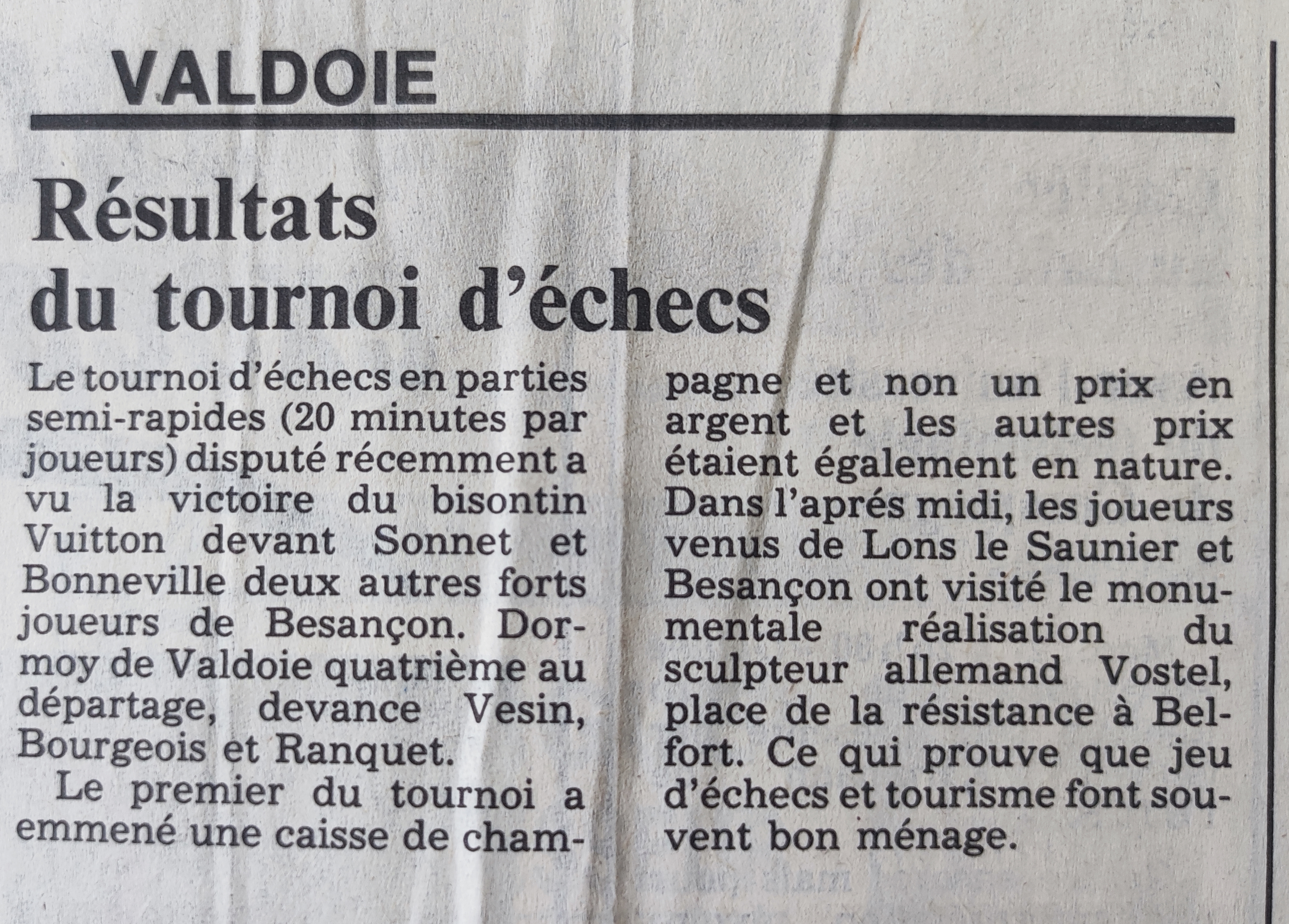 Le premier du tournoi a emmené une caisse de champagne et non un prix en argent et les autres prix étaient également en nature. Dans l'après-midi, les joueurs venus de Lons-le-Saunier et Besançon ont visité la monumentale réalisation du sculpteur allemand Vostel, place de la résistance à Belfort. Ce qui prouve que jeu d'échecs et tourisme font souvent bon ménage. |