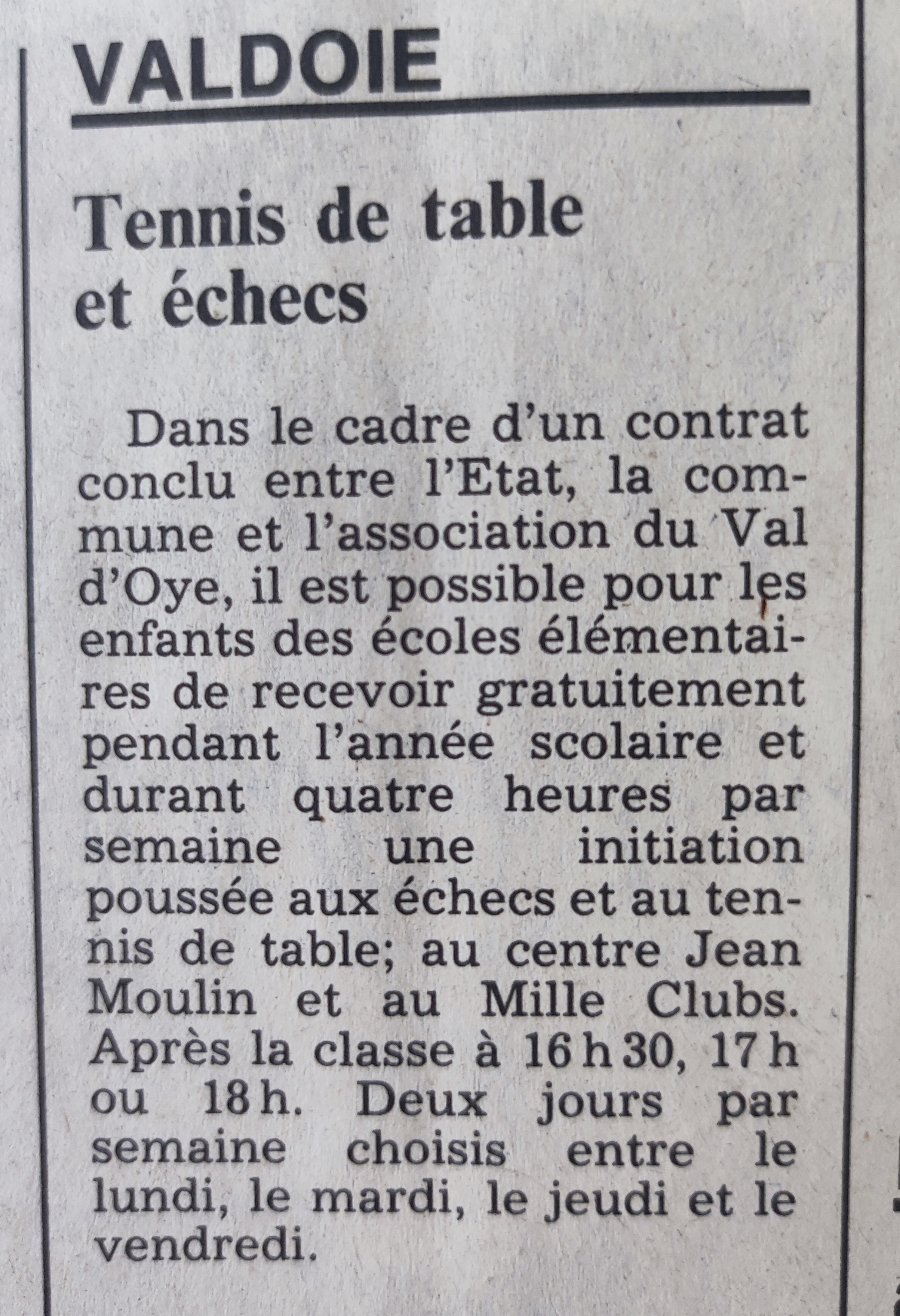 ![]() Dans le cadre d'un contrat conclu entre l'État, la commune et l'association du Val d'Oye, il est possible pour les enfants des écoles élémentaires de recevoir gratuitement pendant l'année scolaire et durant quatre heures par semaine une initiation poussée aux échecs et au tennis de table; au centre Jean Moulin et au Mille Clubs. Après la classe à16h30, 17h ou 18h. Deux jours par semaine choisis entre le lundi, le mardi, le jeudi et le vendredi. |