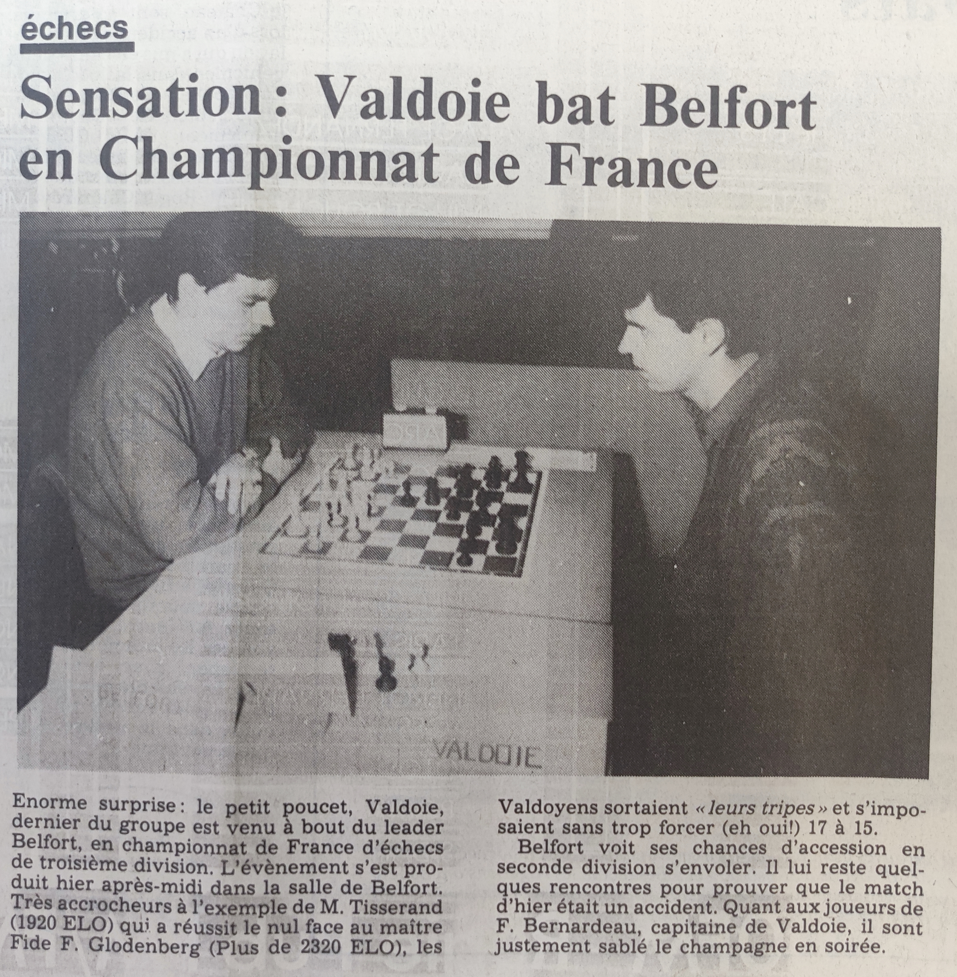 ![]() Énorme surprise : le petit poucet, Valdoie, dernier du groupe est venu à bout du leader Belfort, en championnat de France d'échecs de troisième division. L'événement s'est produit hier après-midi dans la salle de Belfort.
