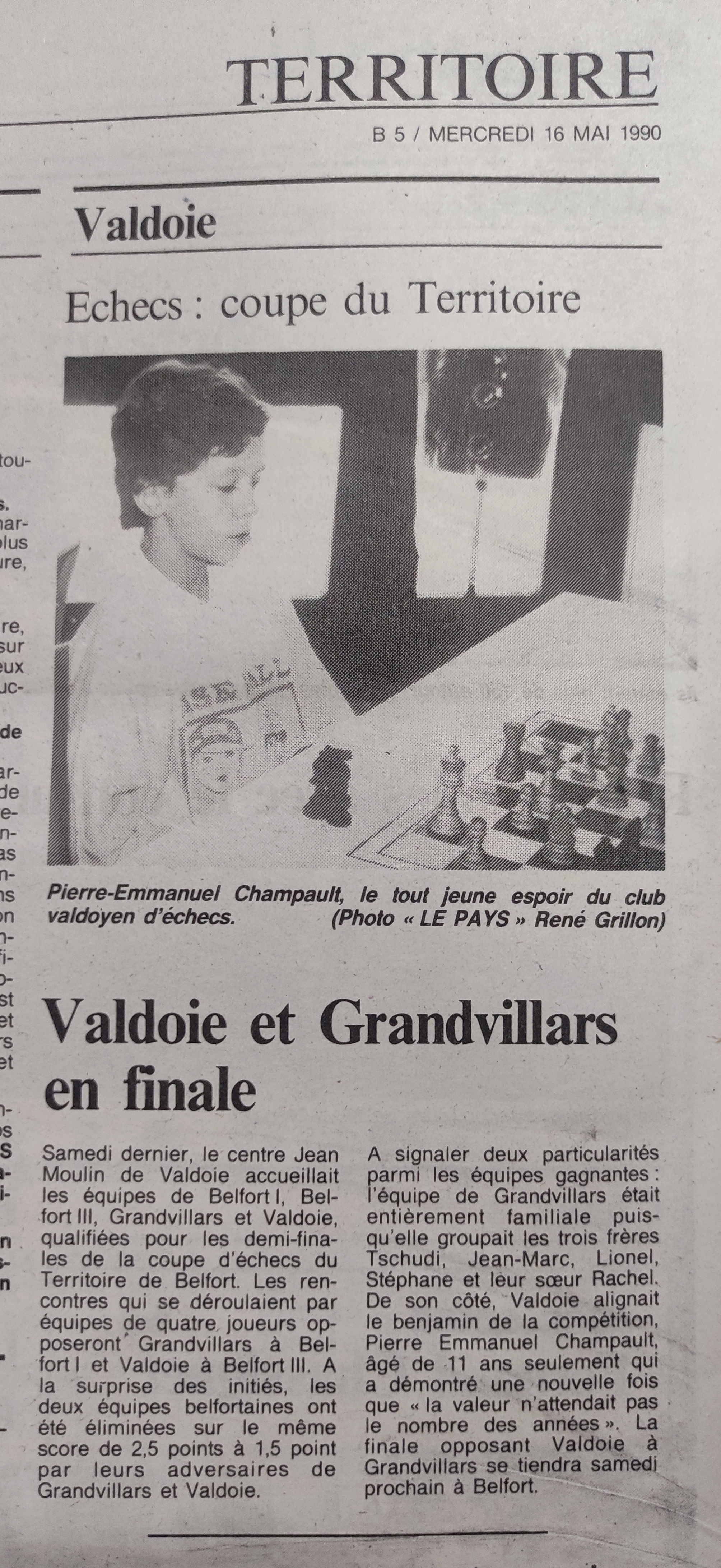 ![]() Pierre-Emmanuel Champault, le tout jeune espoir du club valdoyen d'échecs. (Photo « LE PAYS » René Grillon) Valdoie et Grandvillars en finaleSamedi dernier, le centre Jean Moulin de Valdoie accueillait les équipes de Belfort I, Belfort III, Grandvillars et Valdoie, qualifiées pour les demi-finales de la coupe d'échecs du Territoire de Belfort. Les rencontres qui se déroulaient par équipes de quatre joueurs opposeront Grandvillars à Belfort I et Valdoie et Belfort III. À la surprise des initiés, les deux équipes belfortains ont été éliminées sur le même score de 2,5 points à 1,5 point par leurs adversaires de Grandvillars et Valdoie.À signaler deux particularités parmi les équipes gagnantes : l'équipe de Grandvillars était entièrement familiale puisqu'elle groupait les trois frères Tschudi, Jean-Marc, Lionel, Stéphane et leur sœur Rachèle. De son côté, Valdoie alignait le benjamin de la compétition, Pierre-Emmanuel Champault, âgé de 11 ans seulement qui a démontré une nouvelle fois que « la valeur n'attendait pas le nombre des années ». La finale opposant Valdoie à Grandvillars se tiendra samedi prochain à Belfort. |