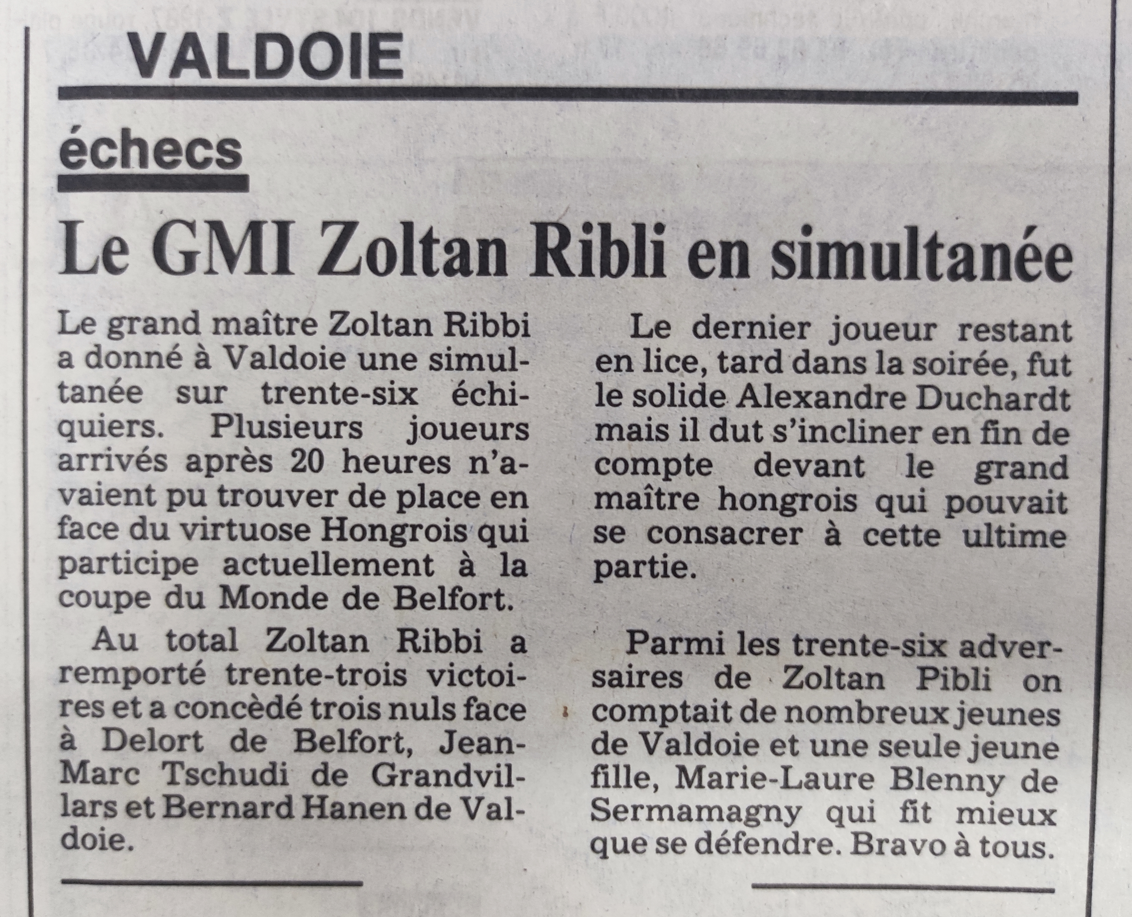 Au total Zoltan Ribli a remporté trente-trois victoires et a concédé trois nuls face à Delort de Belfort, Jean-Marc Tschudi de Grandvillars et Bernard Hanen de Valdoie. Le dernier joueur restant en lice, tard dans la soirée, fut le solide Alexandre Duchardt mais il dut s'incliner en fin de compte devant le grand maître hongrois qui pouvait se consacrer à cette ultime partie. Parmi les trente-six adversaires de Zoltan Ribli on comptait de nombreux jeunes de Valdoie et une seule jeune fille, Marie-Laure Blenny de Sermamagny qui fit mieux que se défendre. Bravo à tous. |