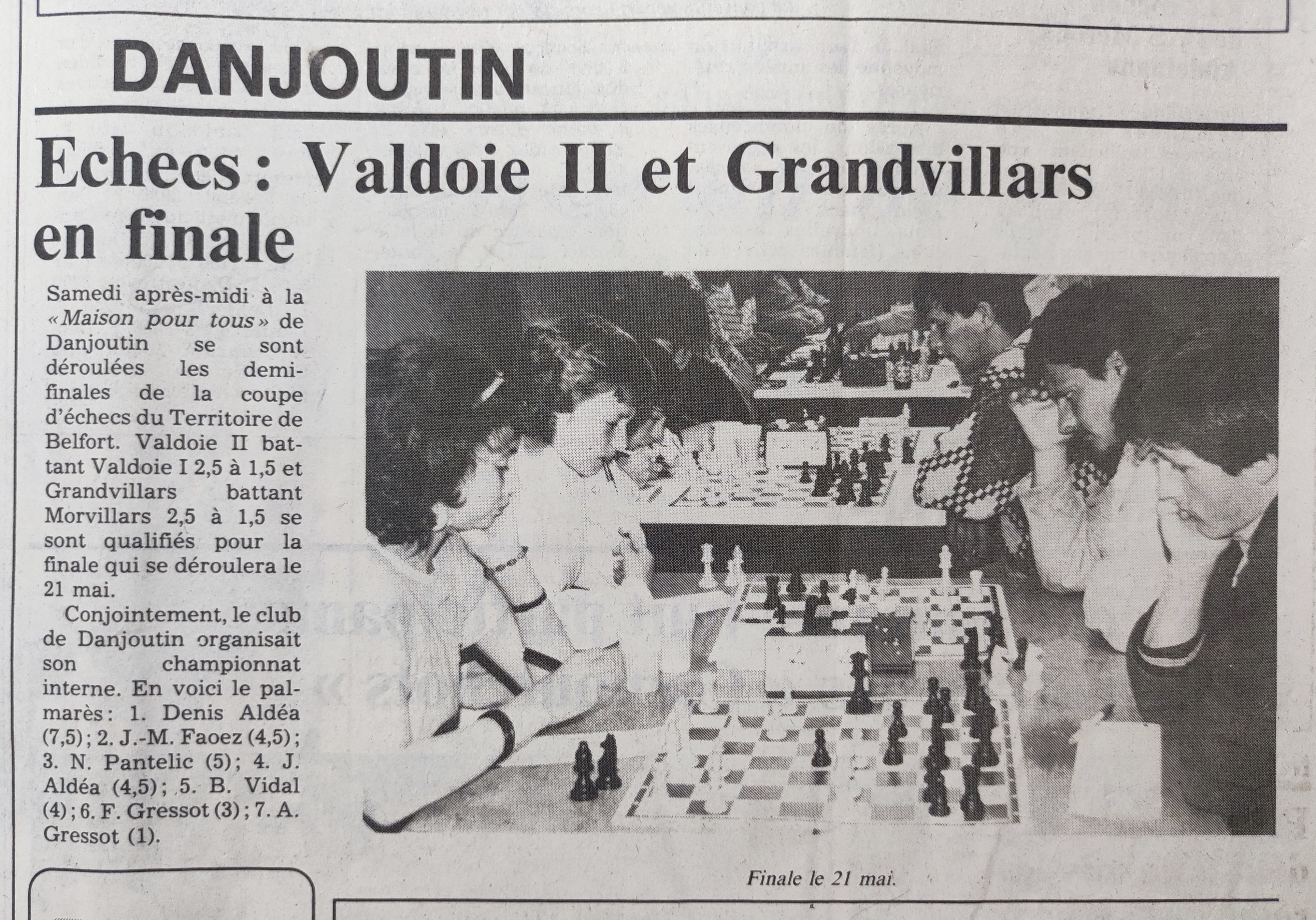 ![]() La finale le 21 mai. Samedi après-midi à la Maison pour tous de Danjoutin se sont déroulées les demi-finales de la Coupe d'échecs du Territoire de Belfort. Valdoie II battant Valdoie I 2,5 à 1,5 et Grandvillars battant Morvillars 2,5 à 1,5 se sont qualifiés pour la finale qui se déroulera le 21 mai.