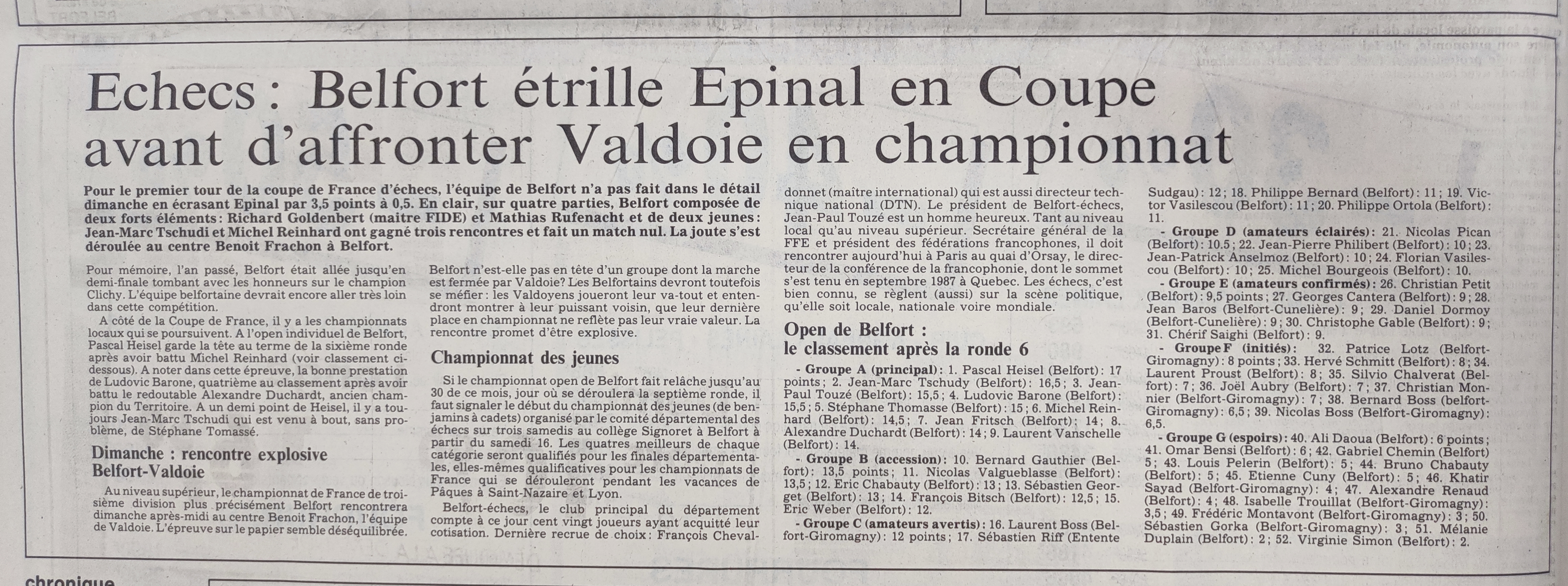 Pour mémoire, l'an passé, Belfort était allée jusqu'en demi-finale tombant avec les honneurs sur le champion Clichy. L'équipe belfortaine devrait encore aller très loin dans cette compétition. À côté de la Coupe de France, il y a les championnats locaux qui se poursuivent. À l'open individuel de Belfort, Pascal Heisel garde la tête au terme de la sixième ronde après avoir battu Michel Reinhardt (voir classement ci-dessous). À noter dans cette épreuve, la bonne prestation de Ludovic Barone, quatrième au classement après avoir battu le redoutable Alexandre Duchardt, ancien champion du Territoire. À un demi point de Heisel, il y a toujours Jean-Marc Tschudi qui est venu à bout, sans problème de Stéphane Thomassé. Dimanche : rencontre explosive Belfort-ValdoieAu niveau supérieur, le championnat de France de troisième division plus précisément Belfort rencontrera dimanche après-midi au centre Benoît Frachon, l'équipe de Valdoie. L'épreuve sur le papier semble déséquilibrée. Belfort n'est-elle pas en tête d'un groupe dont la marche est fermée par Valdoie? Les Belfortains devront toutefois se méfier : les Valdoyens joueront leur va-tout et entendront montrer à leur puissant voisin, que leur dernière place en championnat ne reflète pas leur vraie valeur. La rencontre promet d'être explosive. Championnat des jeunesSi le championnat open de Belfort fait relâche jusqu'au 30 de ce mois, jour où se déroulera la septième ronde, il faut signaler le début du championnat des jeunes (de benjamins à cadets) organisé par le comité départemental des échecs sur trois samedis au collège Signoret à Belfort à partir du samedi 16. Les quatre meilleurs de chaque catégorie seront qualifiés pour les finales départementales; elles-mêmes qualificatives pour les championnats de France qui se dérouleront pendant les vacances de Pâques à Saint-Nazaire et Lyon. Belfort-Échecs, le club principal du département à ce jour cent vingt joueurs ayant acquitté leur cotisation. Dernière recrue de choix : François Chevaldonnet (Maître International) qui est aussi directeur technique national (DTN). Le président de Belfort-Échecs est un homme heureux. Tant au niveau local qu'au niveau supérieur. Secrétaire général de la FFE et président des fédérations francophones, il doit rencontrer aujourd'hui à Paris au Quai d'Orsay, le directeur de la conférence de la francophonie, dont le sommet s'est tenu en septembre 1987 au Québec. Les échecs, c'est bien connu, se règlent (aussi) sur la scène politique, qu'elle soit locale, nationale voire mondiale. Open de Belfort : le classement après la ronde 6- Groupe A (principal) - Groupe B (accession) - Groupe C (amateurs avertis) - Groupe D (amateurs éclairés) - Groupe E (amateurs confirmés) - Groupe F (initiés) - Groupe G (espoirs) |