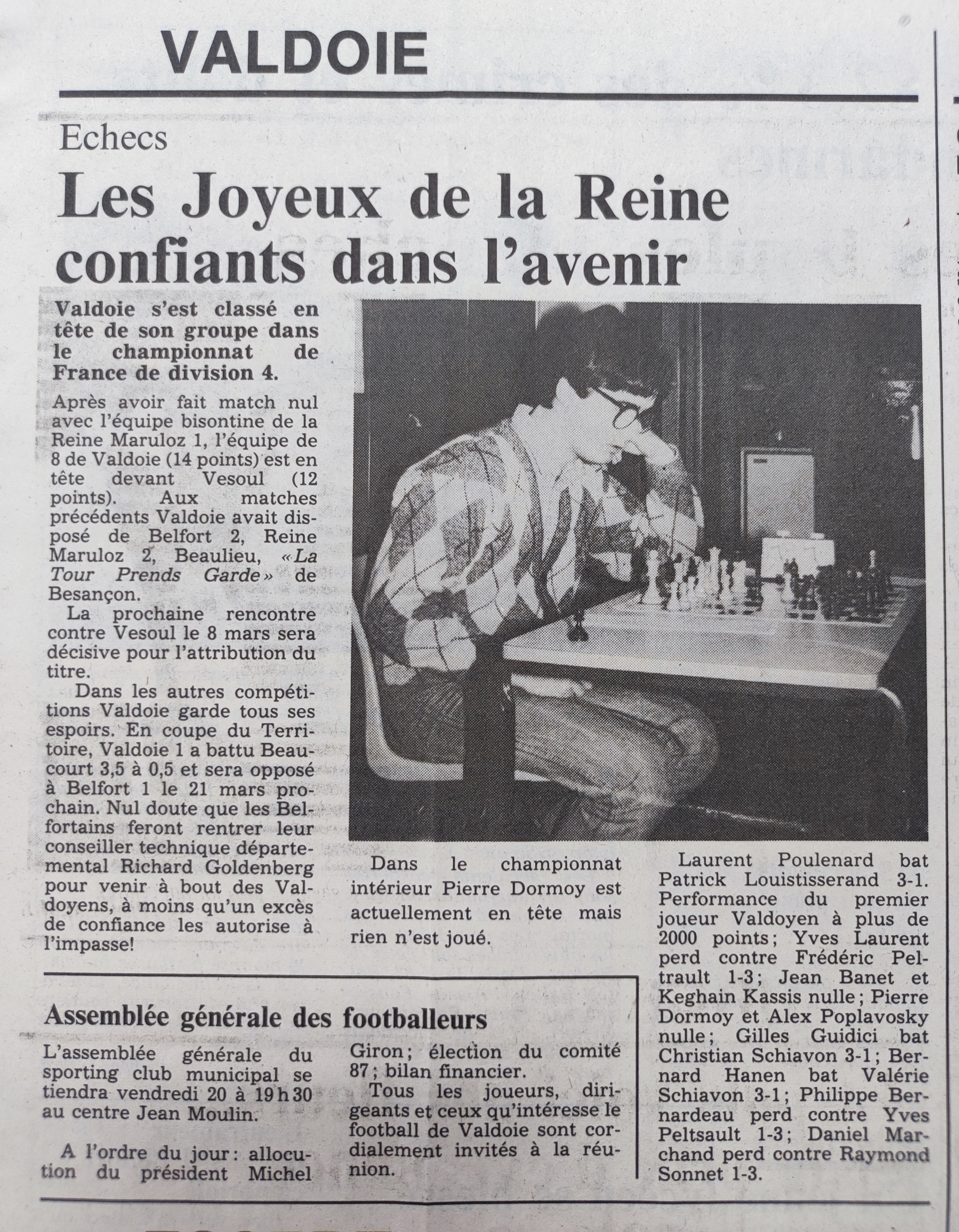 Laurent Poulenard bat Patrick Louistisserand 3-1. Performance du premier joueur Valdoyen à plus de 2000 points; Yves Laurent perd contre Frédéric Peltrault 1-3; Jean Banet et Kegham Kassis nulle; Pierre Dormoy et Alexandre Poplavsky nulle; Gilles Guidici bat Christian Schiavon 3-1; Bernard Hanen bat Valérie Schiavon 3-1; Philippe Bernardeau perd contre Yves Peltrault 1-3; Daniel Marchand perd contre Raymond Sonnet. |