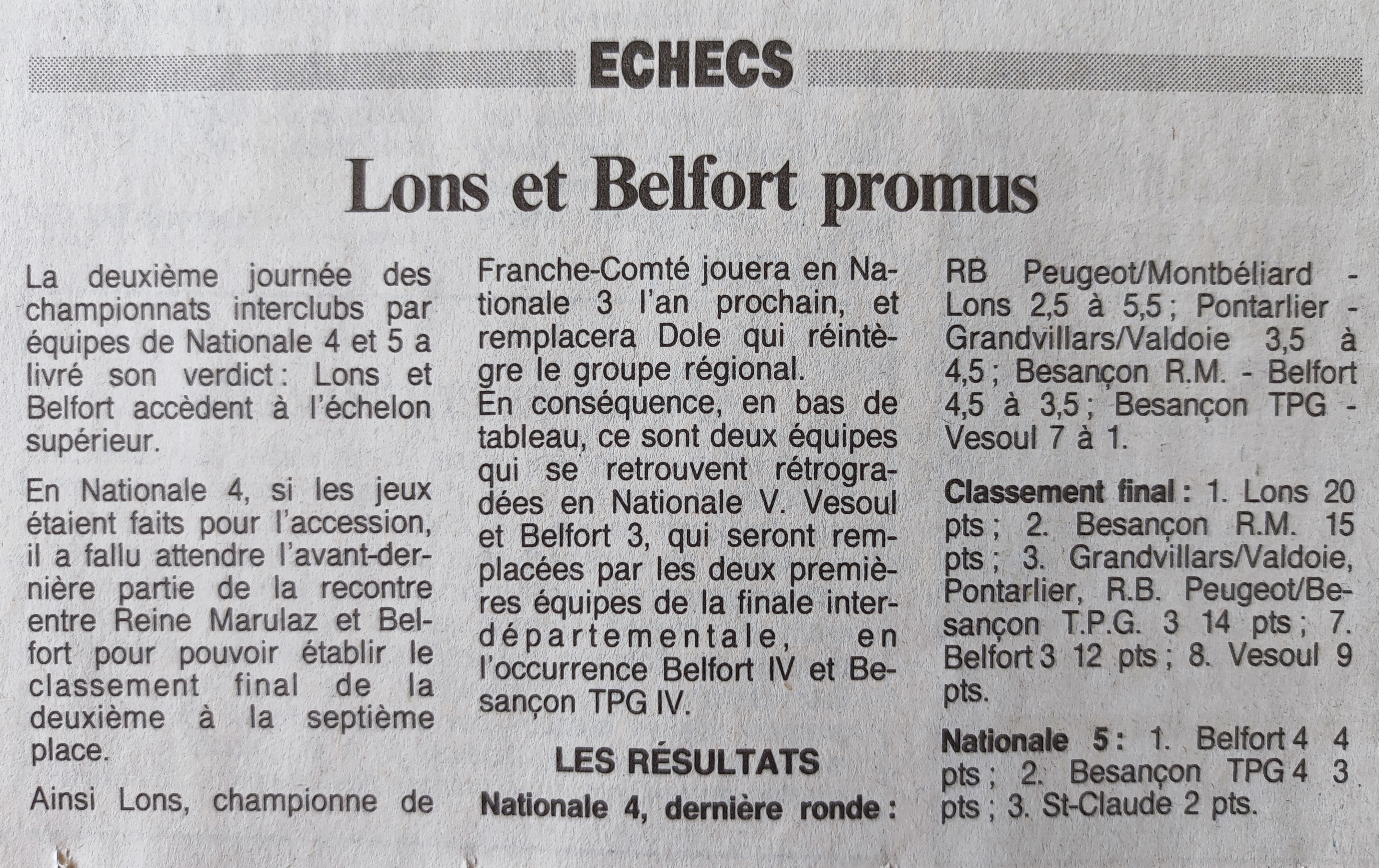 En Nationale 4, si les jeux étaient faits pour l'accession, il a fallu attendre l'avant-dernière partie de la rencontre entre Reine Marulaz et Belfort pour pouvoir établir le classement final de la deuxième à la septième place. Ainsi Lons, championne de Franche-Comté jouera en Nationale 3 l'an prochain, et remplacera Dole qui réintègre le groupe régional. En conséquence, en bas de tableau, ce sont deux équipes qui se retrouvent rétrogradées en Nationale V. Vesoul et Belfort 3, qui seront remplacées par les deux premières équipes de la finale interdépartementale, en l'occurrence Belfort 4 et Besançon TPG 4. LES RÉSULTATSNationale 4, dernière ronde :Classement final : 1. Lons-le-Saunier 20 pts 2. Besançon Reine Marulaz 15 pts 3. Grandvillars-Valdoie 14 pts 4. Pontarlier 14 pts 5. Roi Blanc Peugeot Montbéliard 14 pts 6. Besançon T.P.G! III 14 pts 7. Belfort-Échecs 12 pts 8. Vesoul 9 pts Nationale 5 : 1. Belfort-Échecs IV 4pts 2. Besançon T.P.G! IV 3 pts 3. Saint-Claude 2 pts |