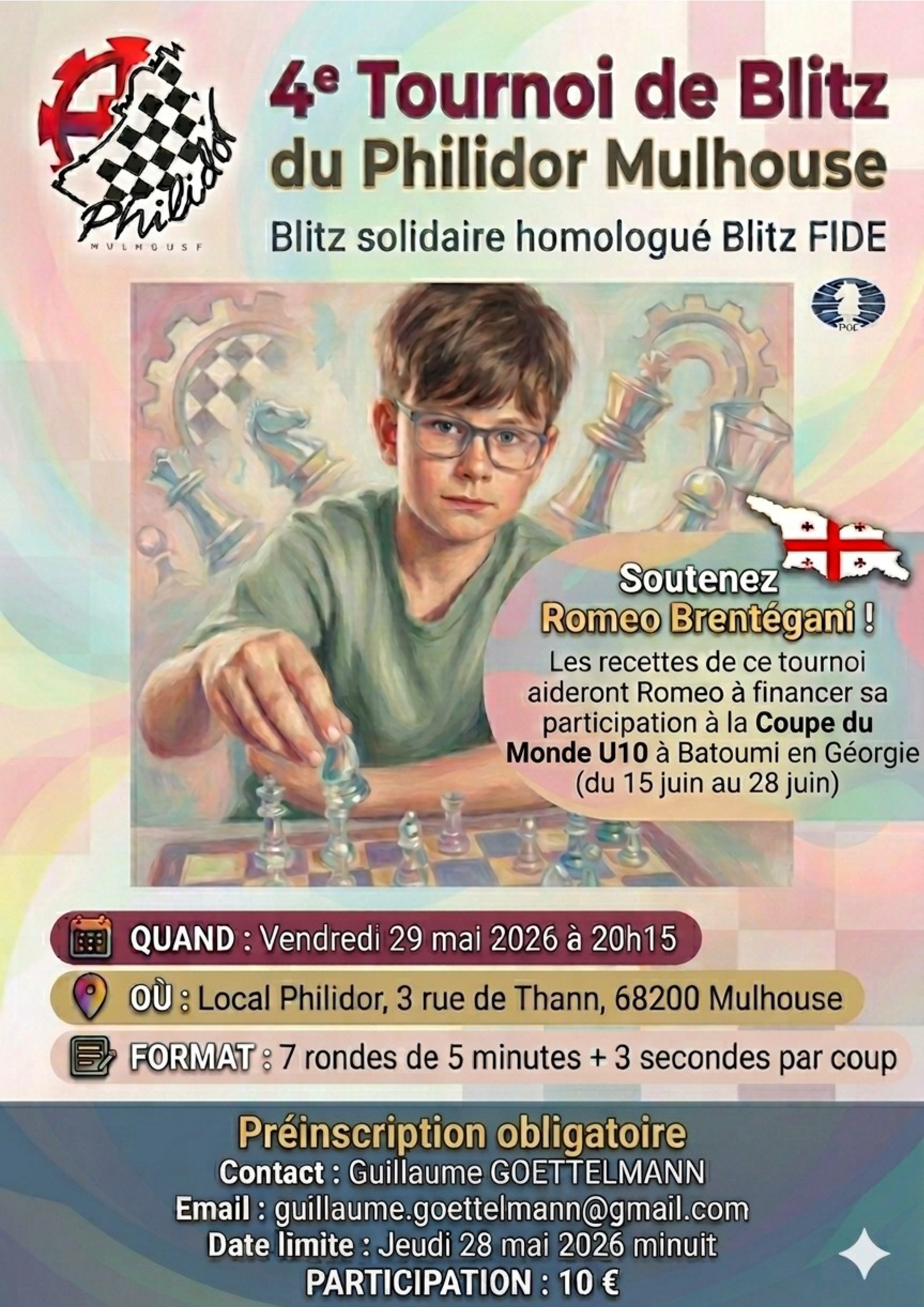 mercredi 00 février 1996 Romeo, 9 ans, va disputer la Coupe du monde d’échecs en Géorgie 18 mars 2026 - L'Est Républicain À dix ans, il crée la surprise face au numéro 2 du Cercle d’échecs 13 mars 2026 - L'Est Républicain Échecs : un jeune champion qui adore résoudre les problèmes 07 mars 2026 - L'Est Républicain Très bonne organisation du championnat régional jeunes d’échecs 26 février 2026 - L'Est Républicain Un 2e open international d’échecs très suivi |