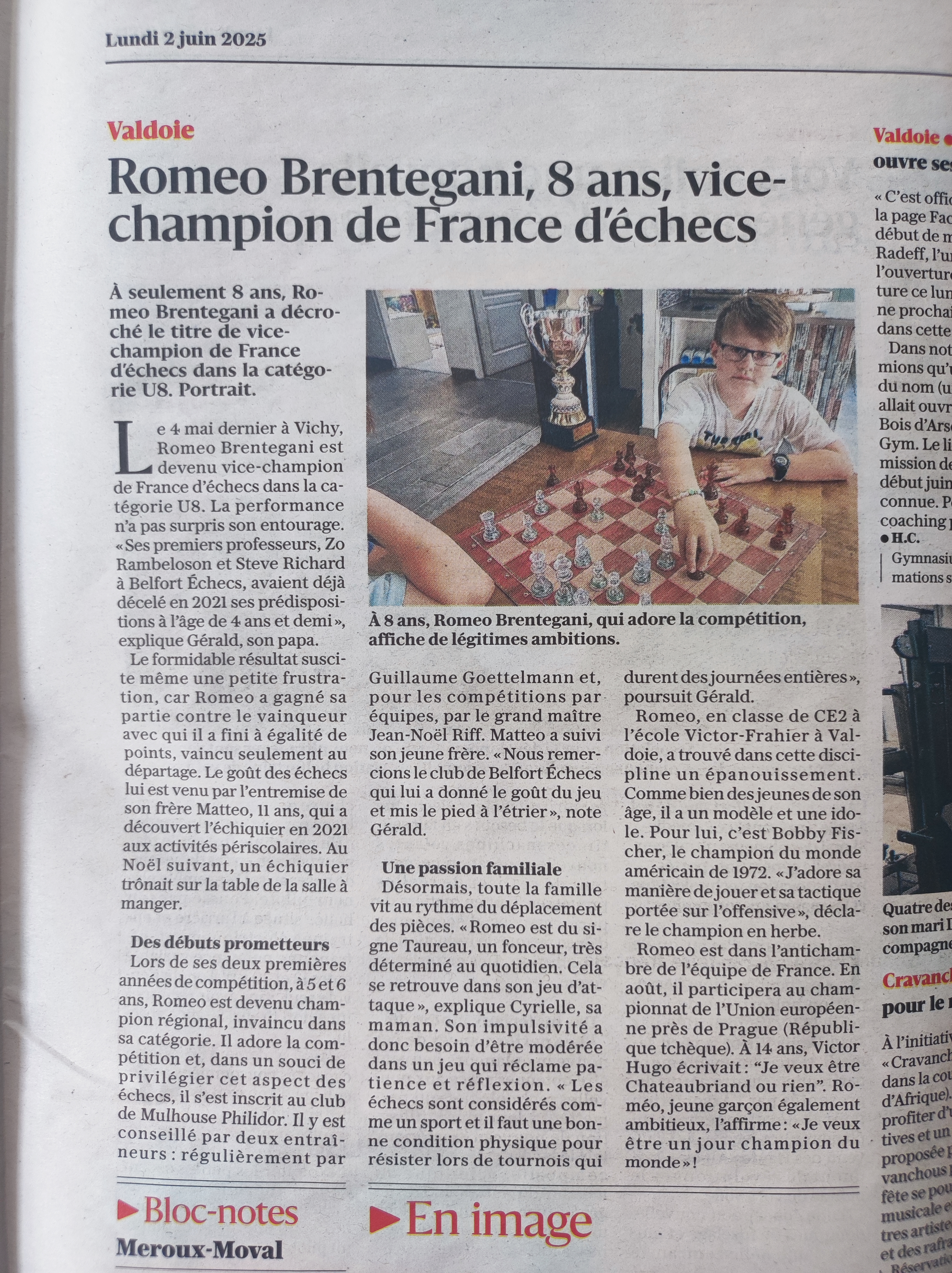 Le 4 mai dernier à Vichy, Romeo Brentegani est devenu vice-champion de France d’échecs dans la catégorie U8. La performance n’a pas surpris son entourage. « Ses premiers professeurs, Zo Rambeloson et Steve Richard à Belfort Échecs, avaient déjà...Lire la suite sur le site de L'Est Républicain |
