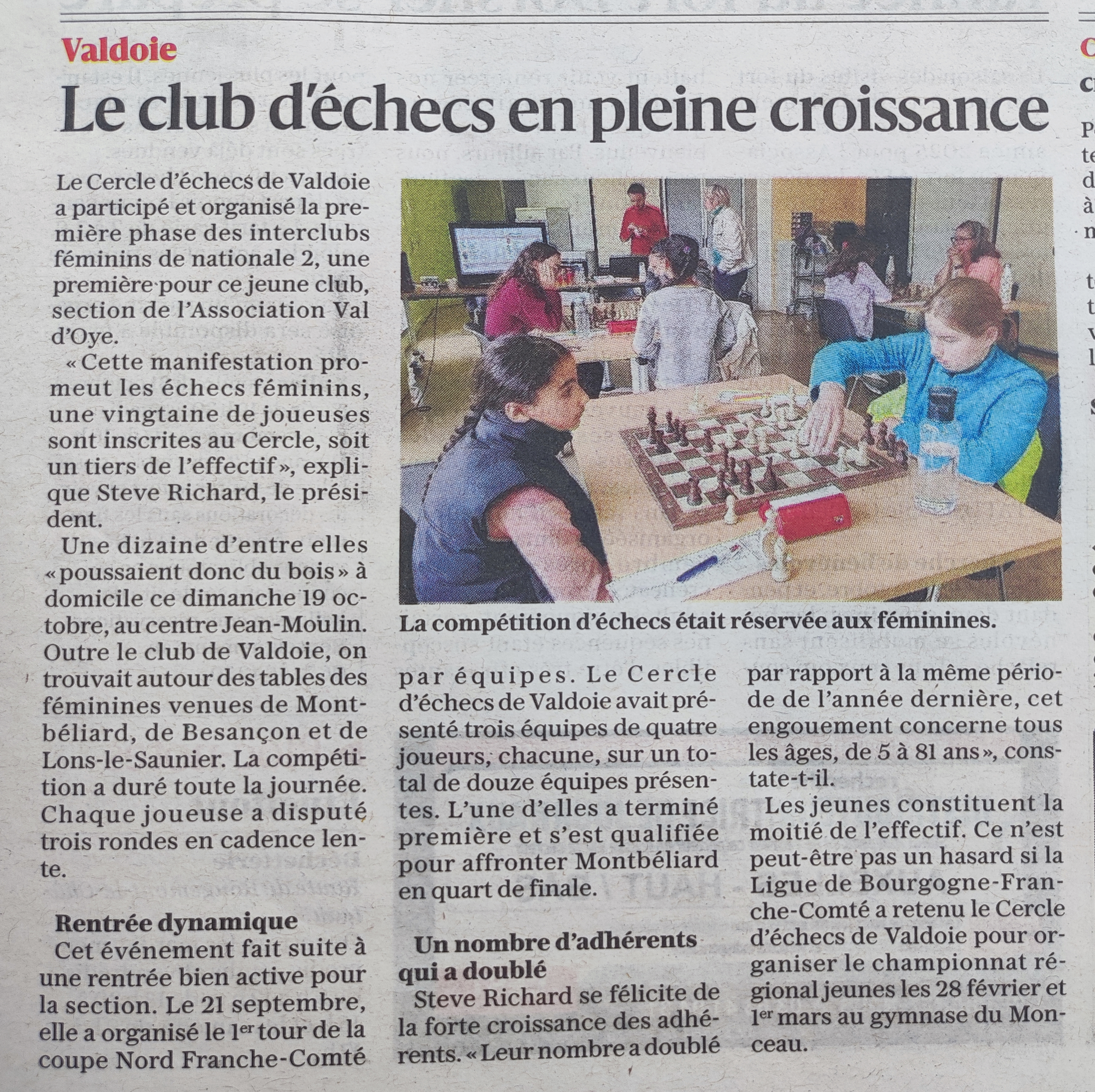 ![]() La compétition d’échecs était réservée aux féminines. Le Cercle d’échecs de Valdoie a participé et organisé la première phase des interclubs féminins de nationale 2, une première pour ce jeune club, section de...Lire la suite sur le site de L'Est Républicain