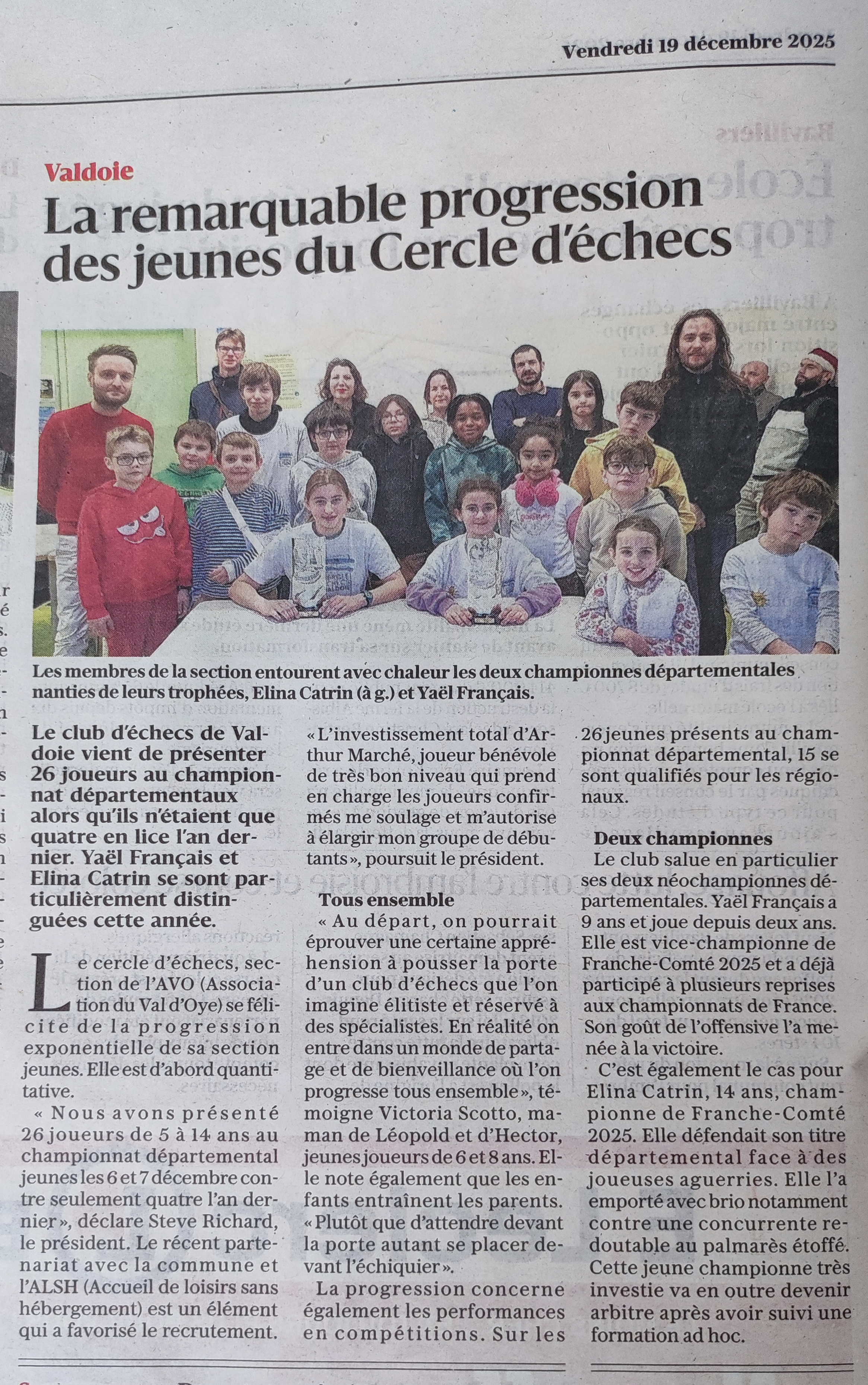 dimanche 17 décembre 2023 La remarquable progression des jeunes du Cercle d’échecs 21 octobre 2025 - L'Est Républicain Le club d’échecs en pleine croissance 24 juin 2025 - L'Est Républicain Centre de loisirs : l’activité échecs reconduite l’an prochain 07 juin 2025 - L'Est Républicain Échecs : les anciens triomphent face à la relève 02 juin 2025 - L'Est Républicain Romeo Brentegani, 8 ans, vice-champion de France d’échecs |