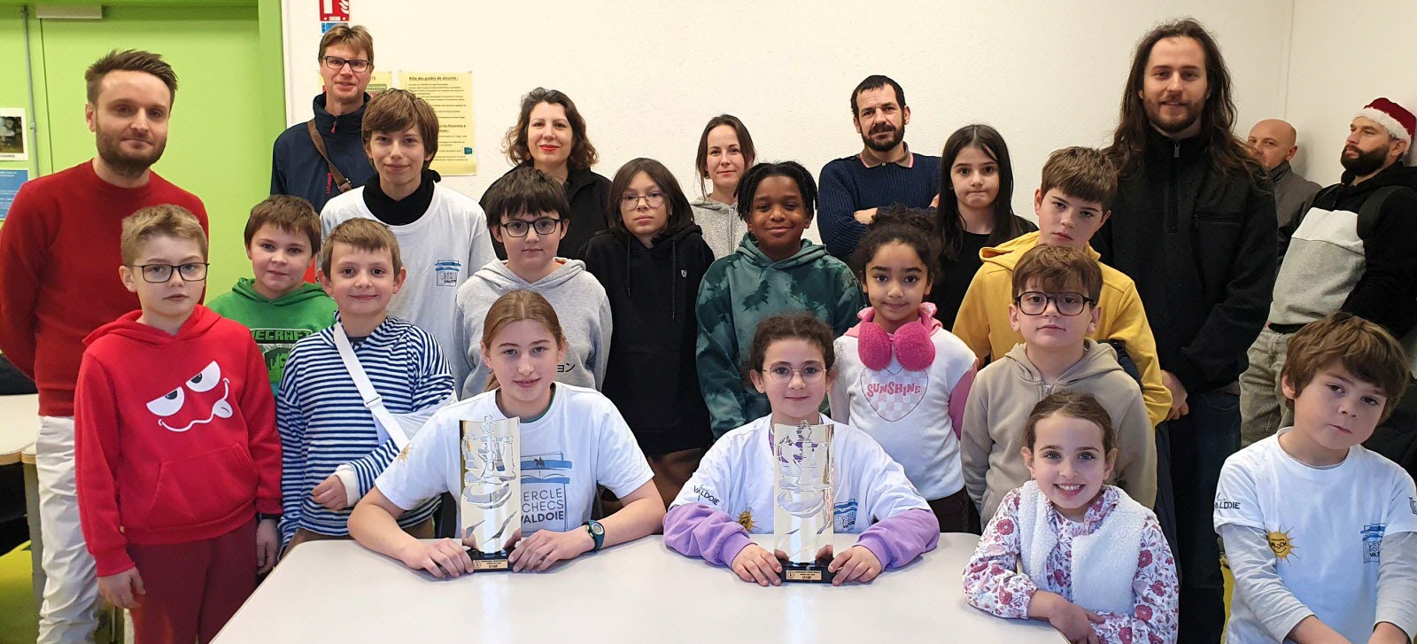 ![]() Les membres de la section entourent avec chaleur les deux championnes départementales nanties de leurs trophées, Elina Catrin (à gauche) et Yaël Français. Le club d’échecs de Valdoie vient de présenter 26 joueurs au championnat départemental alors qu’ils n’étaient que quatre en lice l’an dernier. Yaël Français et Elina Catrin se sont particulièrement distingués cette année.