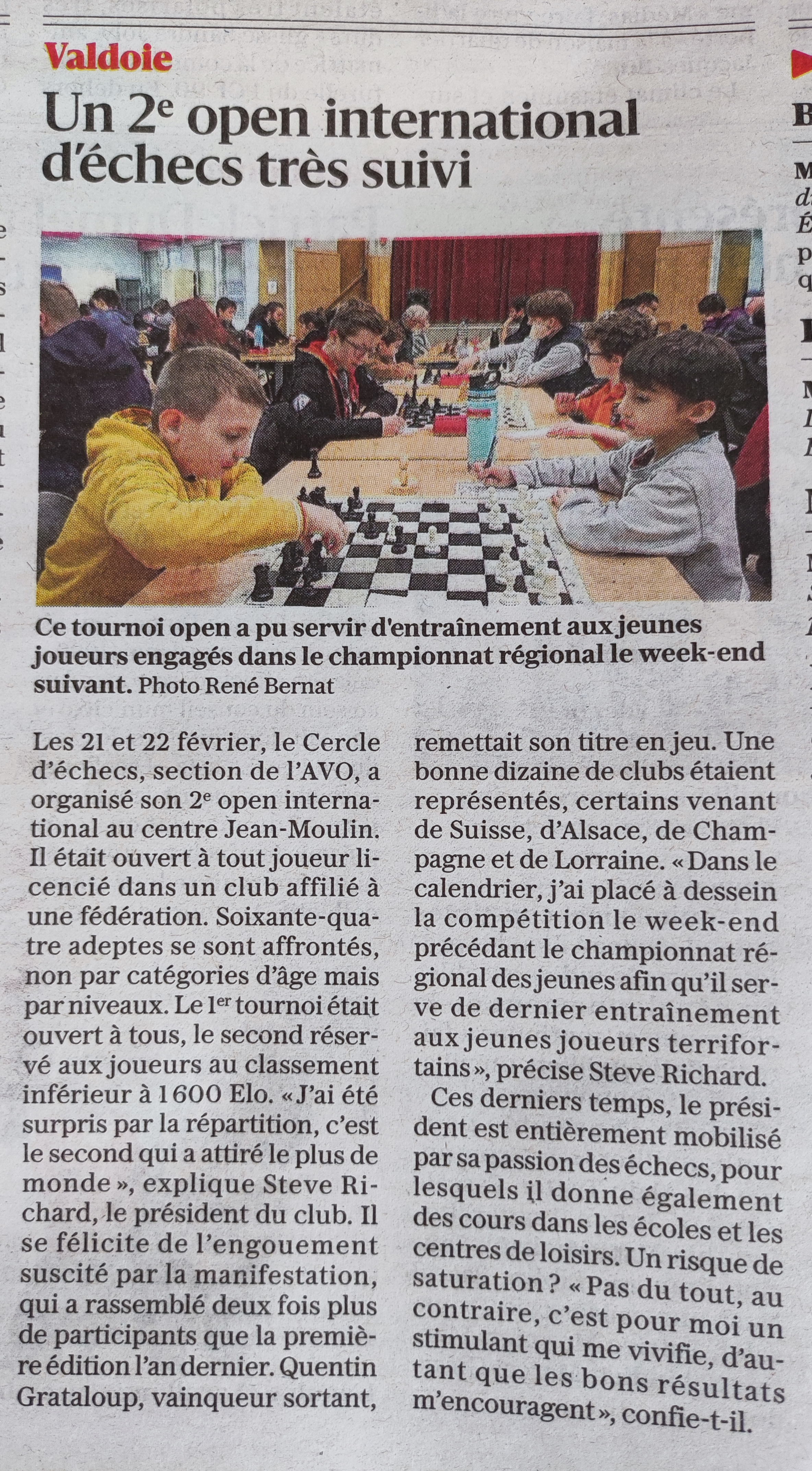 ![]() Ce tournoi open a pu servir d'entraînement aux jeunes joueurs engagés dans le championnat régional le week-end suivant. Photo René Bernat Les 21 et 22 février, le Cercle d’échecs, section de l’AVO, a organisé son 2e open international au centre Jean-Moulin. Il était ouvert à...Lire la suite sur le site de L'Est Républicain